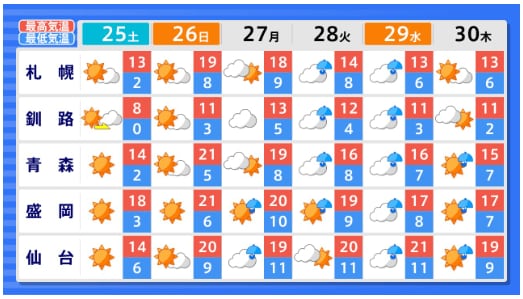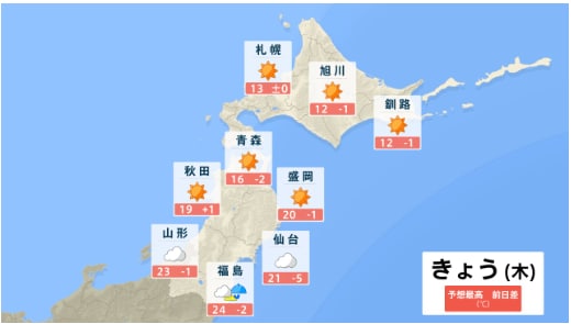 東北地方のGW中の天気はどうなる? 向こう1か月(4/25~5/24)の天候の見通しは? 平均気温・降水量・日照時間は? 東北・全国の天気を画像で 気象庁 2026年4月23日(木) 16:28 国内 ■全国の天気を地方ごとに①