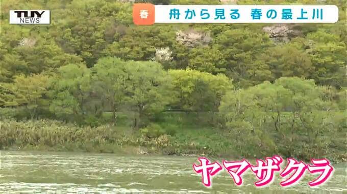 おなかも満たされたころ、舟からは白糸の滝やヤマザクラが見えてきます。