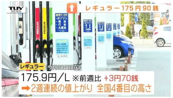 資源エネルギー庁によりますと、今月20日時点の山形県内レギュラーガソリン平均小売価格は175円90銭で前の週より3円70銭値上がりしています。