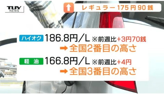 ハイオクは3円70銭値上がりし186円80銭で全国2番目、軽油は4円値上がりし166円80銭で全国3番目の高さとなっています。