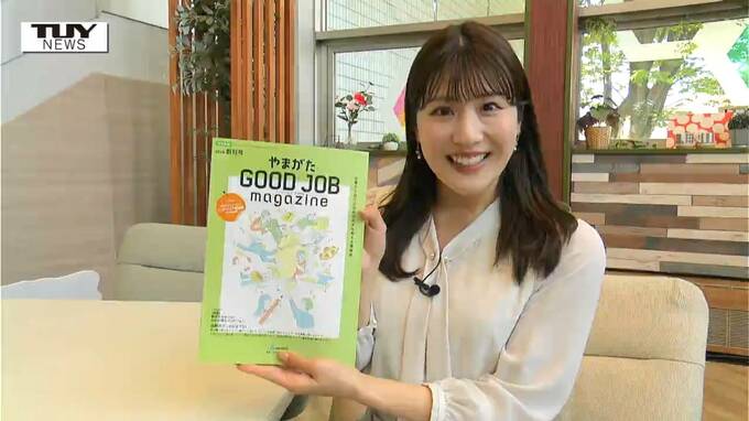 大内希美アナウンサー「山形で働きたいけどどんな仕事があるんだろう。。。進路どうしようかな。。。そんな時に役立つのが『やまがたグッドジョブマガジン』です!」