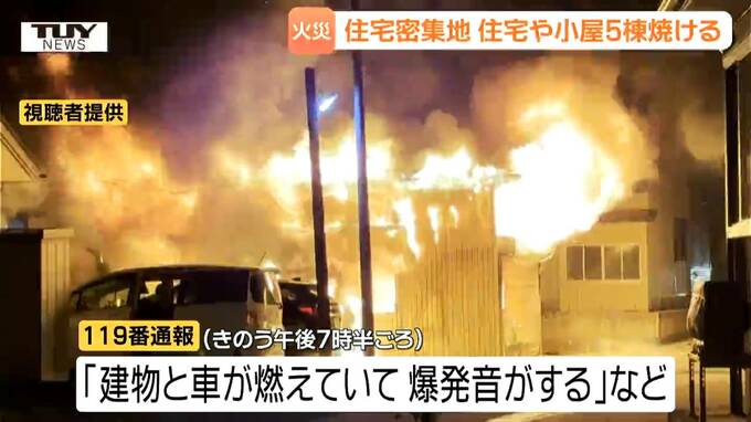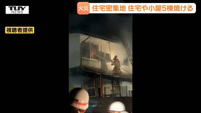 昨夜、山形県寒河江市で火災があり、住宅など5棟が焼けました。最初に火が出た小屋の炎が周辺にも燃え広がったとみられ、夜の住宅街が騒然となりました。