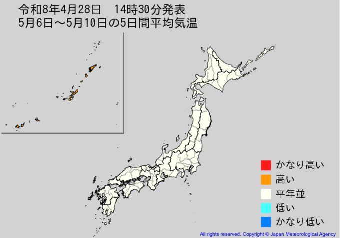 【2週間気温予報】GW中の気温はどうなる? 東北地方と東・西日本の気温は、向こう6日間程度は平年並か低い日が多い予報 その後は平年並の日が多い予報 今後の全国の天気を画像で 気象庁 2026年4月28日(火) 15:08 国内 ■5月6日~5月10日の5日間平均気温(画像) ・8日先から12日先まで5日間平均した日平均気温を表示しています。 ・かなり高い(かなり低い)は、かなり高い(かなり低い)気温となる確率が30%以上のときに表示します。