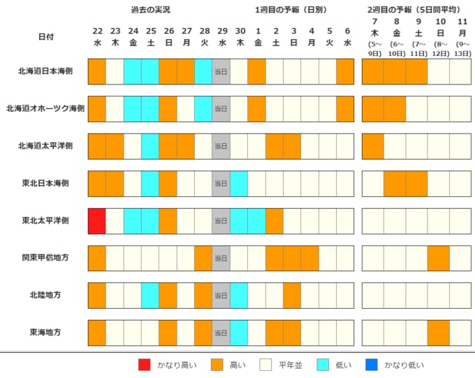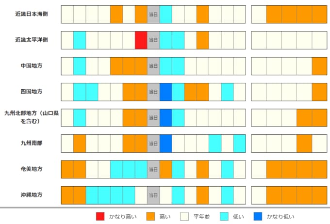ゴールデンウィーク期間中を含む北海道地方の向こう2週間の気温は、平年並か高いでしょう。東北地方と東・西日本の気温は、向こう2日間程度は平年並か低い日が多いですが、その後は平年並の日が多いでしょう。沖縄・奄美の向こう2週間の気温は、平年並か高い日が多いでしょう。