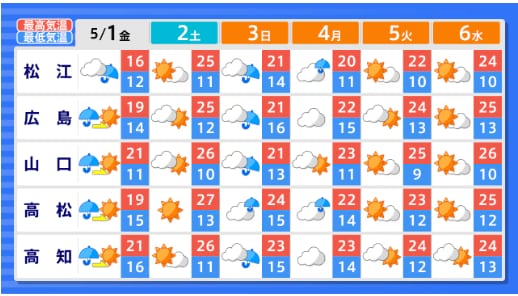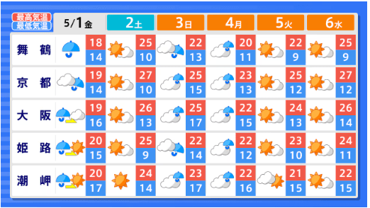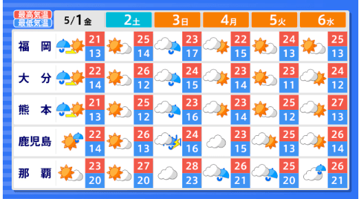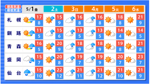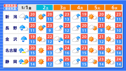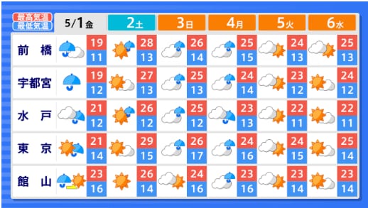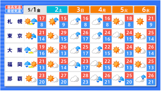 【2週間気温予報】GW中の天気・気温はどうなる? 東北地方と東・西日本の気温は、向こう2日間程度は平年並か低い日が多い予報 その後は平年並の日が多い予報 今後の全国の天気を画像で 気象庁 2026年4月29日(水) 14:59 国内 ■GWの全国の天気はどうなる?(画像) 画像はTBS NEWS DIG Powered by JNNより 画像ありの記事を最初から https://newsdig.tbs.co.jp/articles/-/2633157?display=1