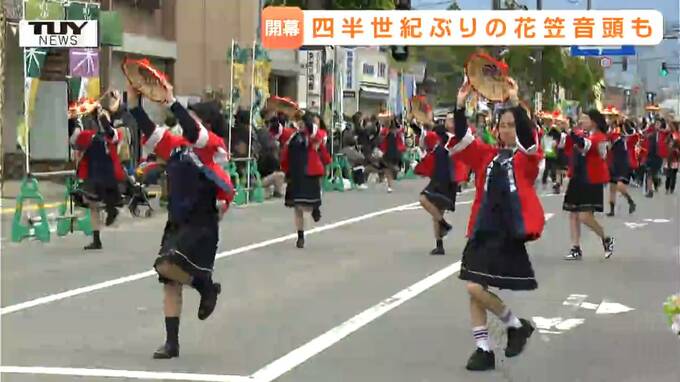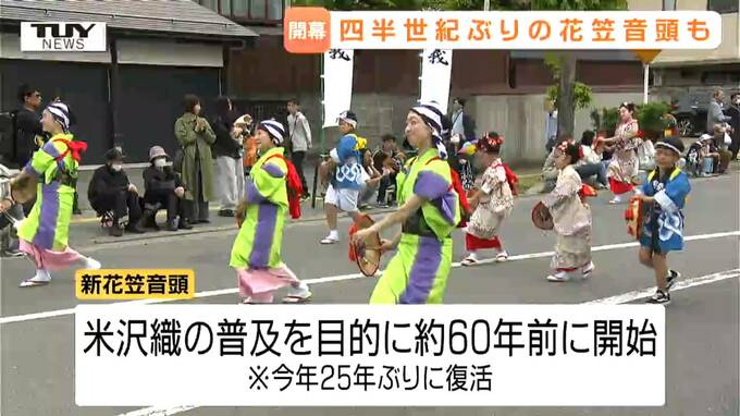市の特産品・米沢織の普及を目的におよそ60年前から始まった「新花笠音頭」が、四半世紀ぶりに披露され、沿道の人たちを魅了しました。
