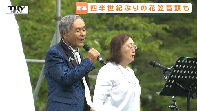 藤井響樹アナウンサー「今年の民踊流しは、25年ぶりに新花笠音頭が復活しました。花笠を大きく使った躍動感あふれる踊りに加え、米沢のものについて触れた曲調がより一層まつりを華やかに盛り上げます」