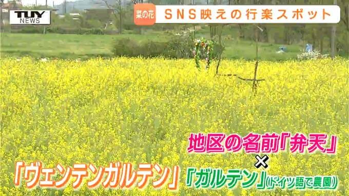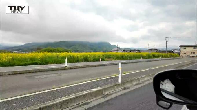 上山市のJR茂吉記念館前駅近く。県道沿いで一際目を引くのが、SNSなどで毎年話題を呼んでいる菜の花畑です。