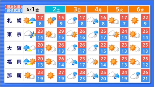 GWの天気はどうなる? 全国各地の観光地・都市の週間天気を画像でわかりやすく 気象情報 2026年4月29日(水) 20:26 国内 ゴールデンウィーク(GW)の天気はどうなるのでしょうか。全国各地の主要都市の連休の天気を画像でご紹介します。旅行やお出かけの参考にしてください。 ■北海道・東北