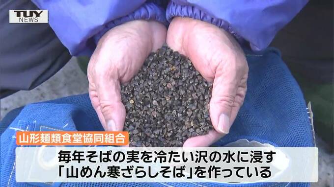 山形麺類食堂協同組合では、毎年、寒さが厳しくなる「大寒」に合わせて、そばの実を、冷たい沢の水に浸す、「山めん寒ざらしそば」を作っています。