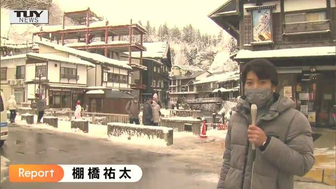報告・棚橋祐太「雪化粧をした銀山温泉街。朝から大勢の観光客でにぎわっている」