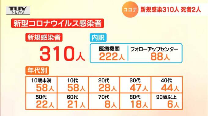 山形県新型コロナ新規感染310人 死者2人 2023年2月1日(水) 18:51 国内 山形県がきょう(1日)発表した新型コロナの新規感染者は310人。内訳は、10歳未満と10代が58人、30代47人、40代44人などとなっています。65歳以上など発生届の対象は56人で、保健所別に、庄内19人、置賜12人などで…