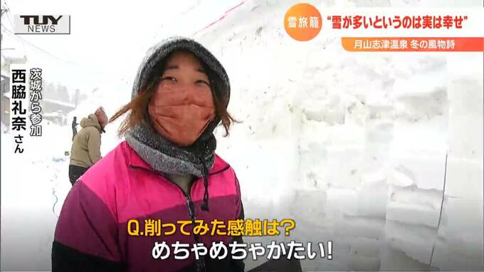 茨城から参加・西脇礼奈さん「人生の中では一番すごい雪だなと思います。(Q削ってみた感触は?)めちゃめちゃかたい!完成のためにやるって考えるとがんばれる」