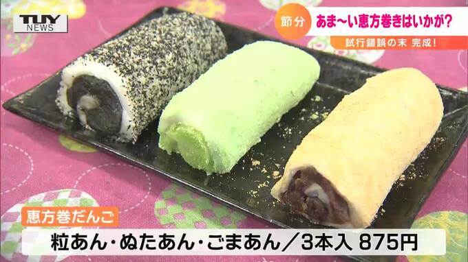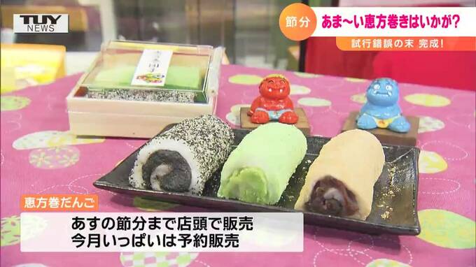 恵方巻だんごは、あす(2月3日)の節分まで店頭で販売するほか、今月いっぱいは予約販売を行うということです。