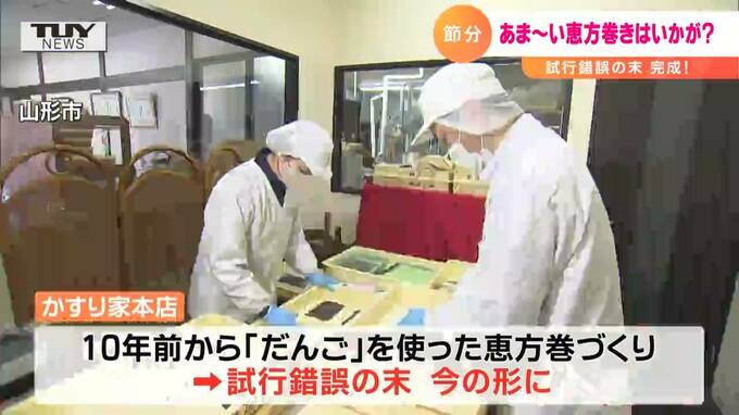 山形市のかすり家本店では、10年前から店自慢の「だんご」を使った恵方巻を作っていて、試行錯誤の末、今の形にたどり着いたそうです。