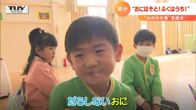 豆まきをして、子どもたちが心の中の鬼を退治します。みんなの心の中にはどんな鬼がいるのかな?