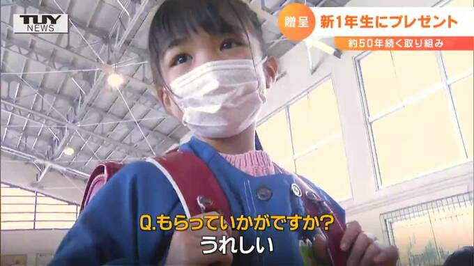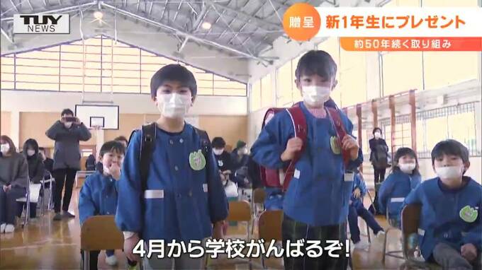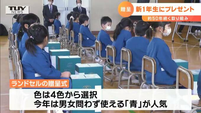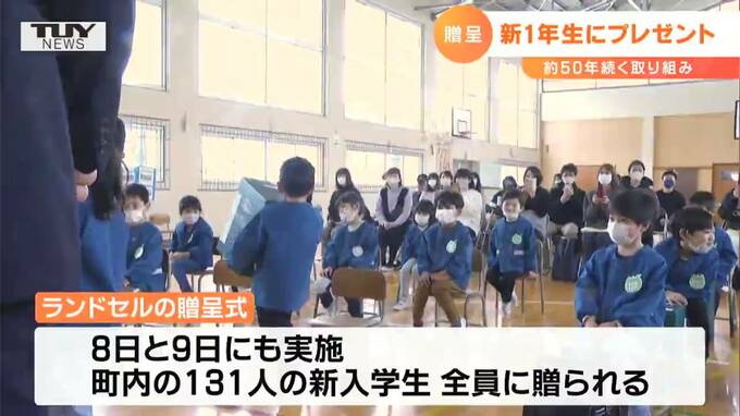 ランドセルの贈呈は8日と9日にも行われ、町の131人の新入学生全員に贈られるということです。