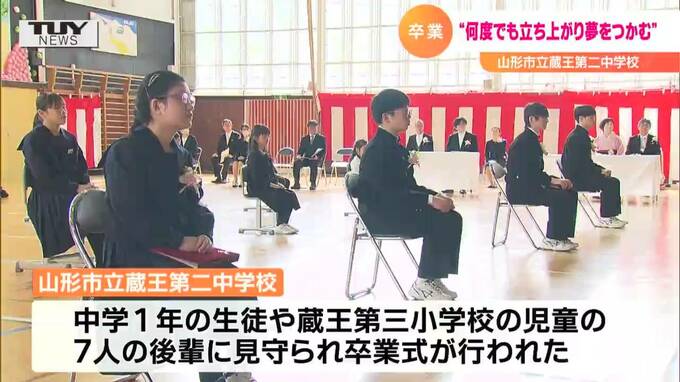 きょうは、中学1年の生徒や、同じ校舎で学ぶ蔵王第三小学校の児童など7人の後輩に見守られ、卒業式に臨みました。