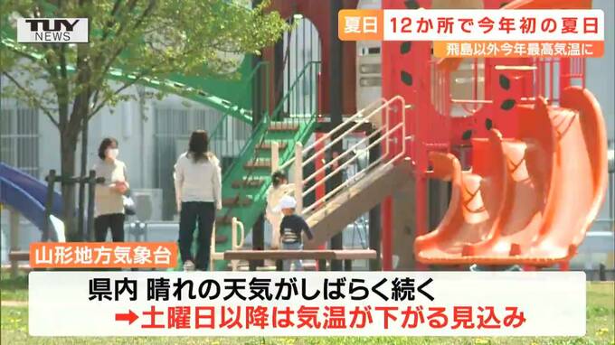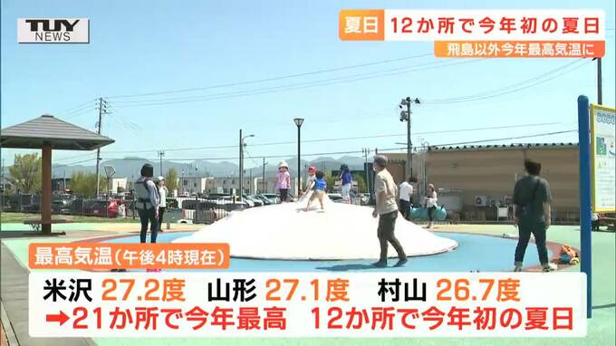 最高気温は米沢で27.2度、山形で27.1度など、22ある気象台の観測地点のうち飛島を除く21か所で今年最高、12か所で今年初の夏日となりました。