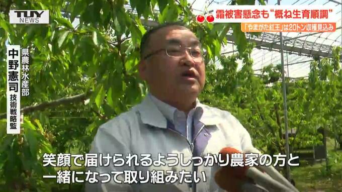 県農林水産部・中野憲司技術戦略監「とても安堵、安心した感じのいい成り具合で、農家のかたがご苦労されたんだろうなと感じる第一印象です。山形のさくらんぼを全国でお待ちしているお客さまに笑顔で届けられるようにしっかり農家のかたと一緒になって取り組みたい」