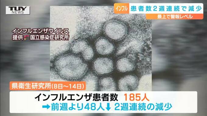 県衛生研究所によりますと、今月8日からの1週間で43の定点医療機関から報告されたインフルエンザの患者数は185人で、前の週より48人少なくなり、2週連続の減少です。