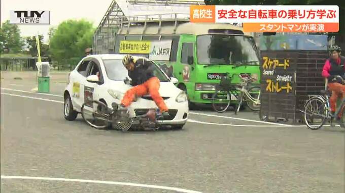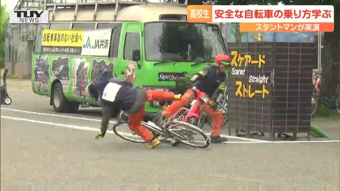 プロのスタントマンが様々なケースの事故を実演することで、高校生に安全な自転車の乗り方を学んでもらうのが狙いです。