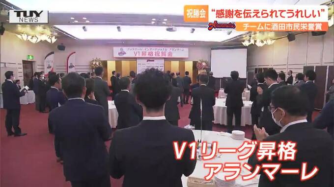 19日は山形県酒田市で祝勝会が開かれ、丸山酒田市長やパートナー企業など関係者およそ70人が集まり、アランマーレの昇格を祝いました。