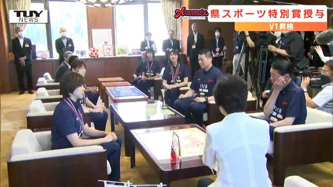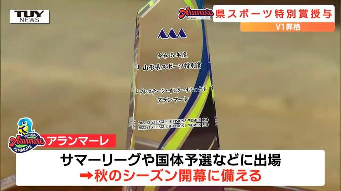 トップリーグに昇格した、バレーボール女子のプレステージ・インターナショナル・アランマーレに19日、「山形県スポーツ特別賞」が贈られました。
