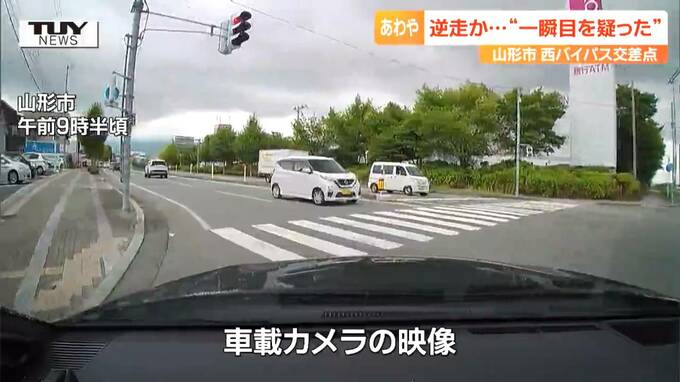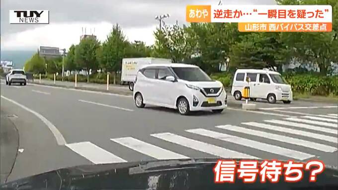 軽乗用車は、逆走に気が付かずに信号待ちをしているように見えます。