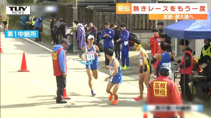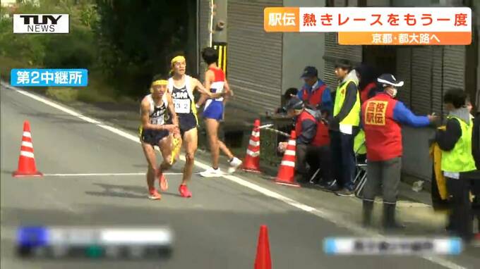 第1中継所では、上位3校ほぼ差がない状態でタスキリレー。