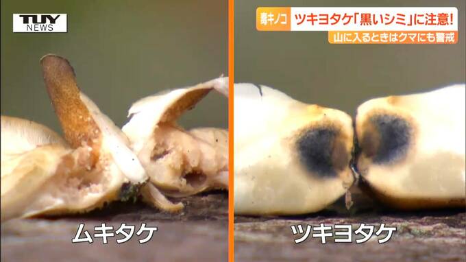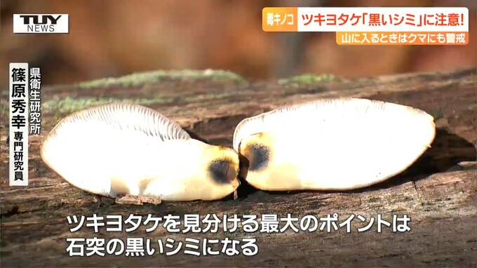 県衛生研究所・篠原秀幸専門研究員「2つに割ると、石突が黒くなっていて、黒いシミが見える。ツキヨタケを見分ける最大のポイントは、石突の黒いシミになる。一番は2つに割っていただいてこのシミを確認していただくことが一番重要」