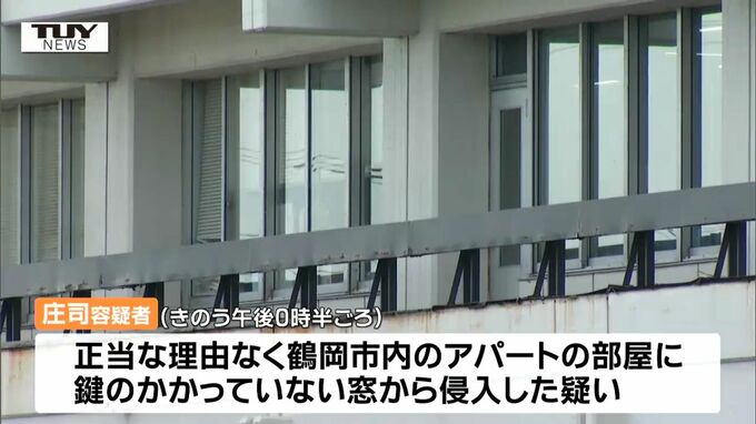 警察によりますと、庄司容疑者はきのう午後0時半ごろ、正当な理由がないのに鶴岡市内のアパートの部屋に鍵のかかっていない窓から侵入した疑いがもたれています。