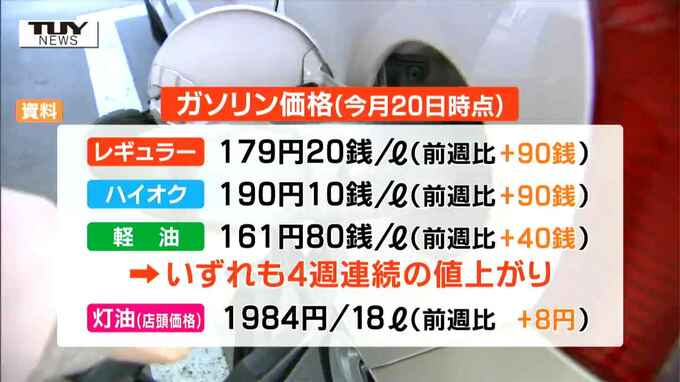 ガソリン価格4週連続の値上がり 来週も値上がり予想 2023年11月24日(金) 12:49 国内 県内最新のレギュラーガソリンの平均小売価格は179円20銭で、4週連続の値上がりとなりました。来週も値上がりが予想されています。資源エネルギー庁によりますと、今月20日時点の県内レギュラーガソリンの平均小売…