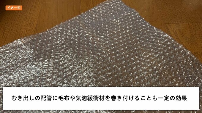 応急的な対策としては、むき出しの配管に毛布や、荷物の保護などに使う気泡緩衝材を巻き付けるといったものがあります。