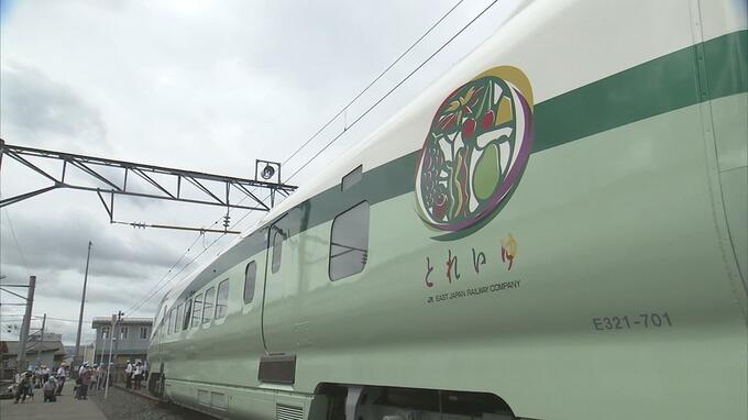 新幹線初のリゾート列車「とれいゆ」。列車の「トレイン」とフランス語の太陽を意味する「ソレイユ」を合わせた造語です。山形デスティネーションキャンペーンの目玉として山形新幹線に導入されました。もともとは秋田新幹線「こまち」に使われていた車両を2年がかりで改造した車体です。この車両の目玉が…。
