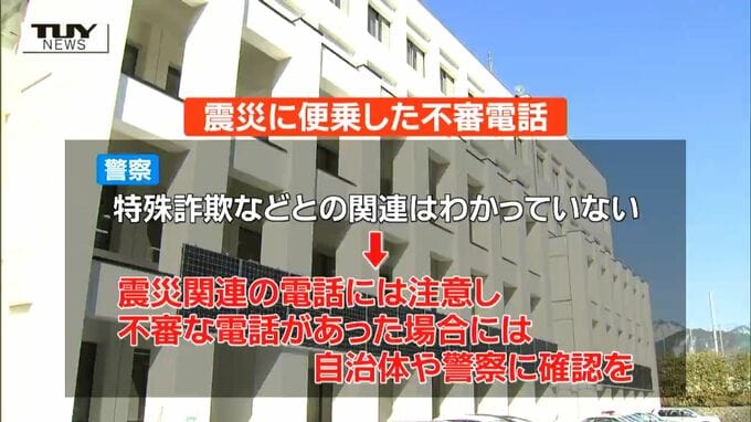 警察は、特殊詐欺などとの関連はわかっていないとしていますが、震災関連の電話には注意し、不審な電話があった場合には自治体や警察に確認し、1人で対応しないよう呼びかけています。