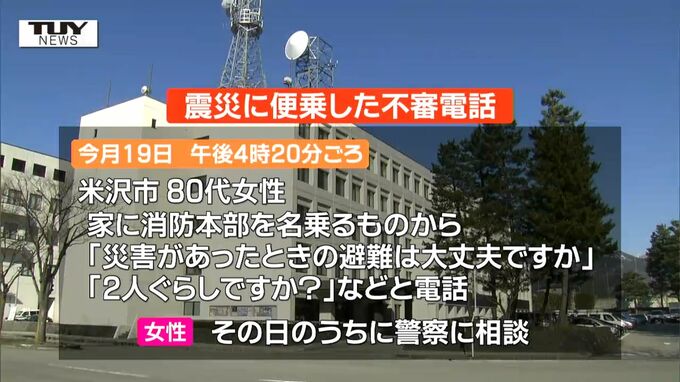 警察によりますと、今月19日の午後4時20分ごろ、米沢市の80代女性の家に消防本部を名乗るものから「災害があったときの避難は大丈夫ですか?」「2人ぐらしですか?」などと家族構成を聞き出そうとする不審な電話がありました。