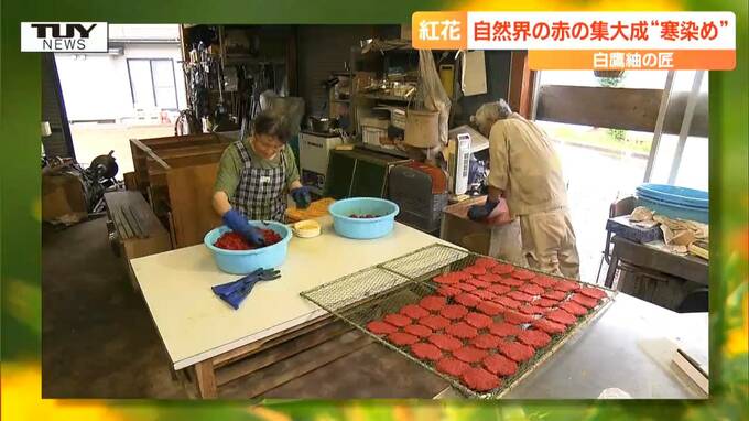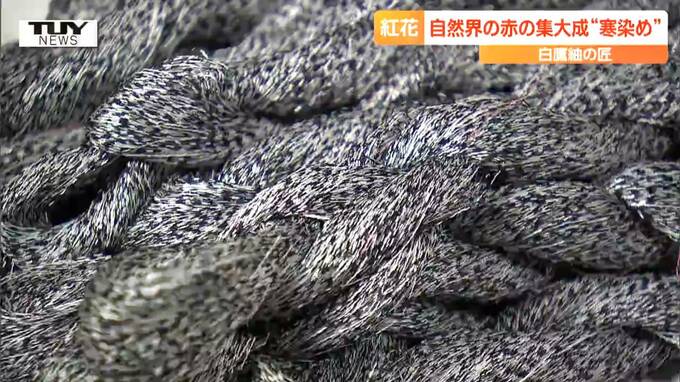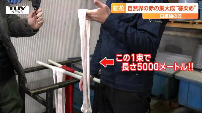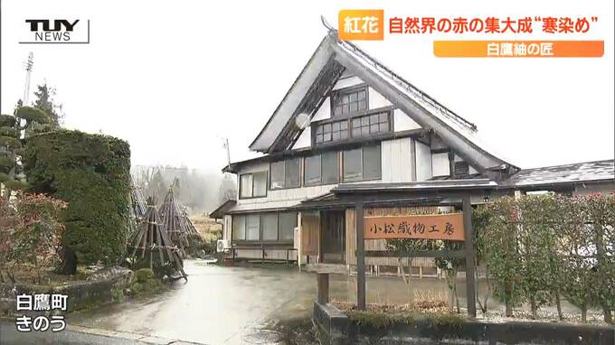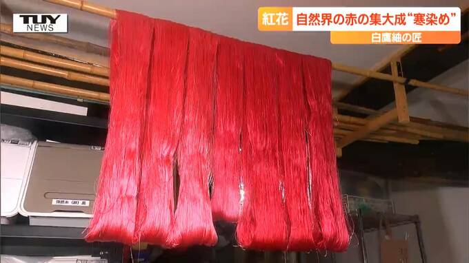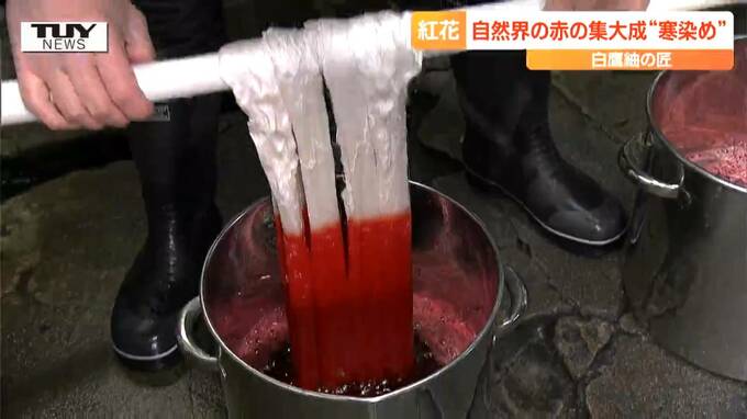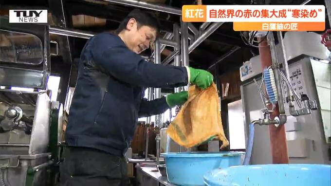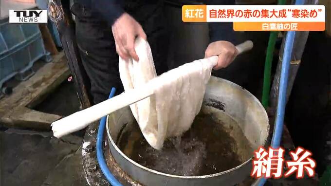 山形県白鷹町の工房では、大寒の時期に合わせた、一年に一度だけの、紅花の寒染め(かんぞめ)が行われています。
