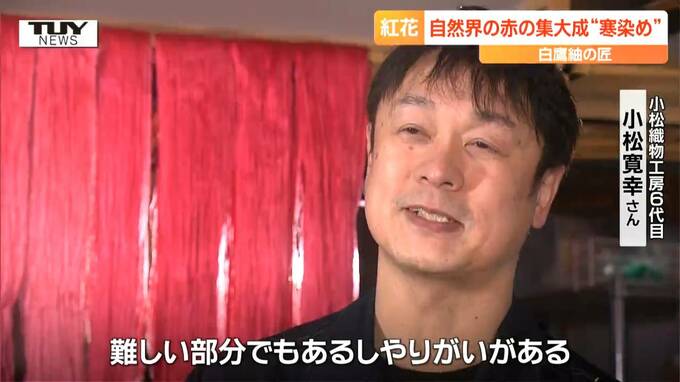 小松織物工房6代目・小松寛幸さん「紅花は育つのは夏場だが染めるのに適しているのは冬なので我々もその時期を狙って紅花染めをしている」