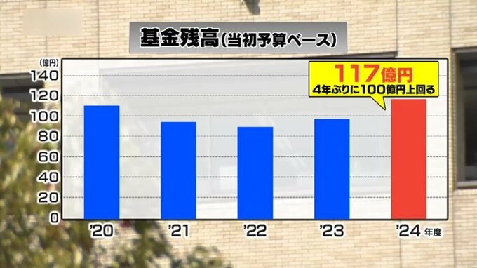 蓄えにあたる「基金残高」はおよそ117億円で、県が「維持すべき」とする100億円を当初予算ベースで4年ぶりに上回りました。