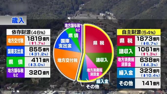 収入に当たる歳入は、県が直接調達できる「自主財源」の半分近くを占める「県税」が、個人県民税の減収などにより今年度よりおよそ135億円減っています。