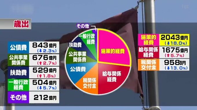 一方、支出に当たる歳出では、最も大きい「施策的経費」が今年度より448億円ほど低くなりました。