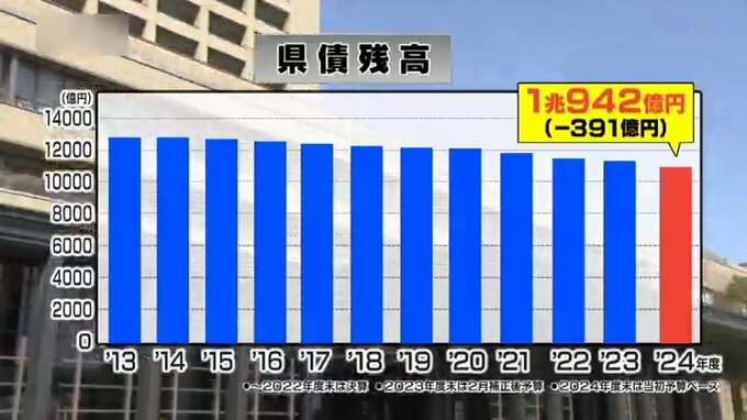 借金の総額である「県債残高」は、391億円減って11年連続の減少です。