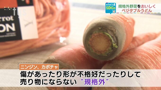 ジャンルを問わず、さまざまな料理にアレンジすることができます。去年11月に、防府市の小野小学校の給食で提供され、おいしいと好評だったそうです。麺に使われているニンジンとカボチャは、傷があったり形が不格好だったりして売り物にならない規格外なんです。