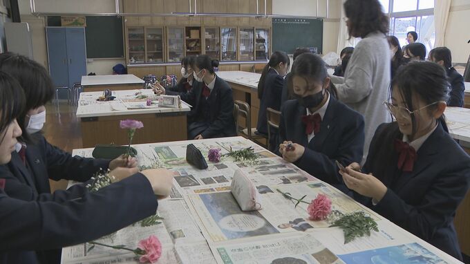 山口県周南市の高校生が22日、来月の卒業式に向けて卒業生に贈るコサージュの作り方を学びました。