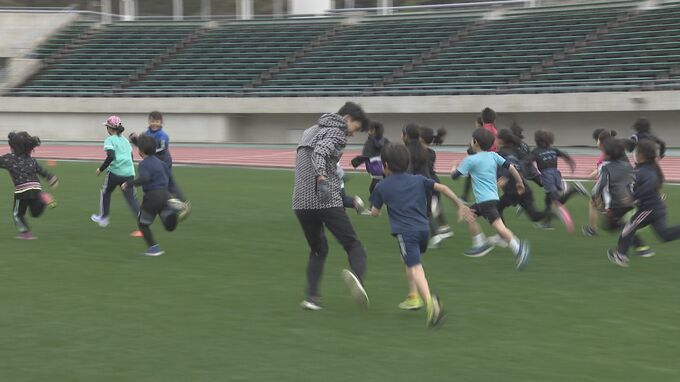 子どもたちが実業団選手から直接指導を受ける陸上教室が23日、山口県山口市でありました。