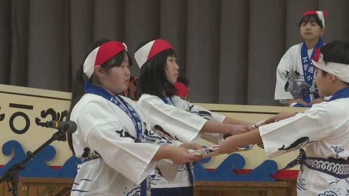 かつて古式捕鯨が盛んだった山口県長門市の小学校で、伝統の「鯨唄」の引き継ぎ式がありました。