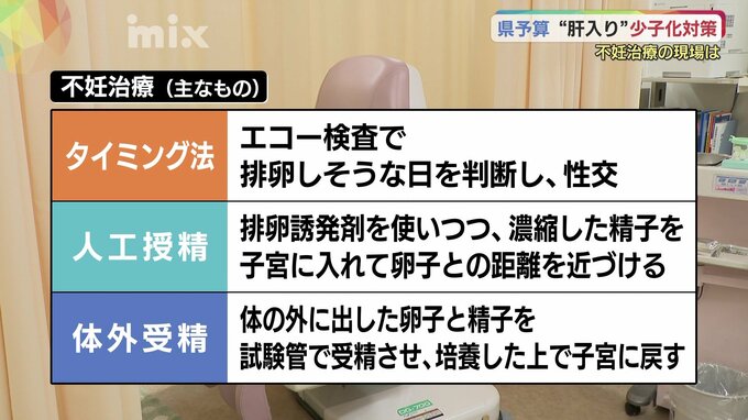 その奥には体外受精をする部屋。ここでは、最先端の機械も稼働していました。治療の金額は「タイミング法」は受診料、「人工授精」は1回数千円程度。県は「タイミング法」をはじめとする「一般的な治療」には1年度あたり3万円以内、「人工授精」では1年度あたり9千円以内の助成を設けています。この助成は、新年度も維持されます。
