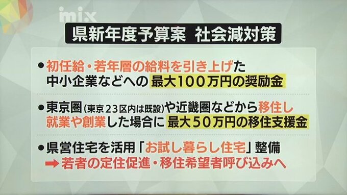 東京圏や近畿圏などから移住し就業や創業した場合に最大50万円の移住支援金を創設するほか、県営住宅を活用した「お試し暮らし住宅」を整備します。