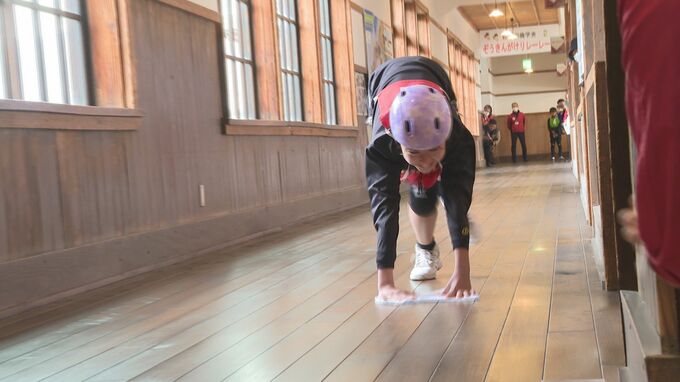 山口県萩市の小学校の旧校舎「萩・明倫学舎」で3日、長い廊下をぞうきんがけする大会が開かれました。